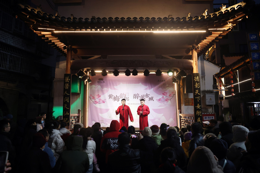 老城核心区域的倒扒狮等历史文化街区,不仅有璀璨灯光勾勒青砖黛瓦的古韵,更有“人工降雪”“气球放飞”等浪漫场景营造沉浸式体验,两岸四地明星歌曲LIVE、随机舞蹈等潮流活动与黄梅戏名家专场演出轮番登场,传统戏韵与现代活力碰撞交融。安庆博物馆也突破传统观展模式,推出“博物馆之夜”活动,通过戏曲展演、非遗展示、互动体验等形式,实现古今文化对话。